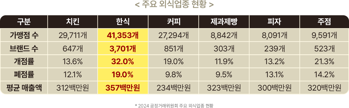 한식은 폐점 수가 가장 많지만, 이는 곧 업종의 규모가 가장 크다는 뜻이며